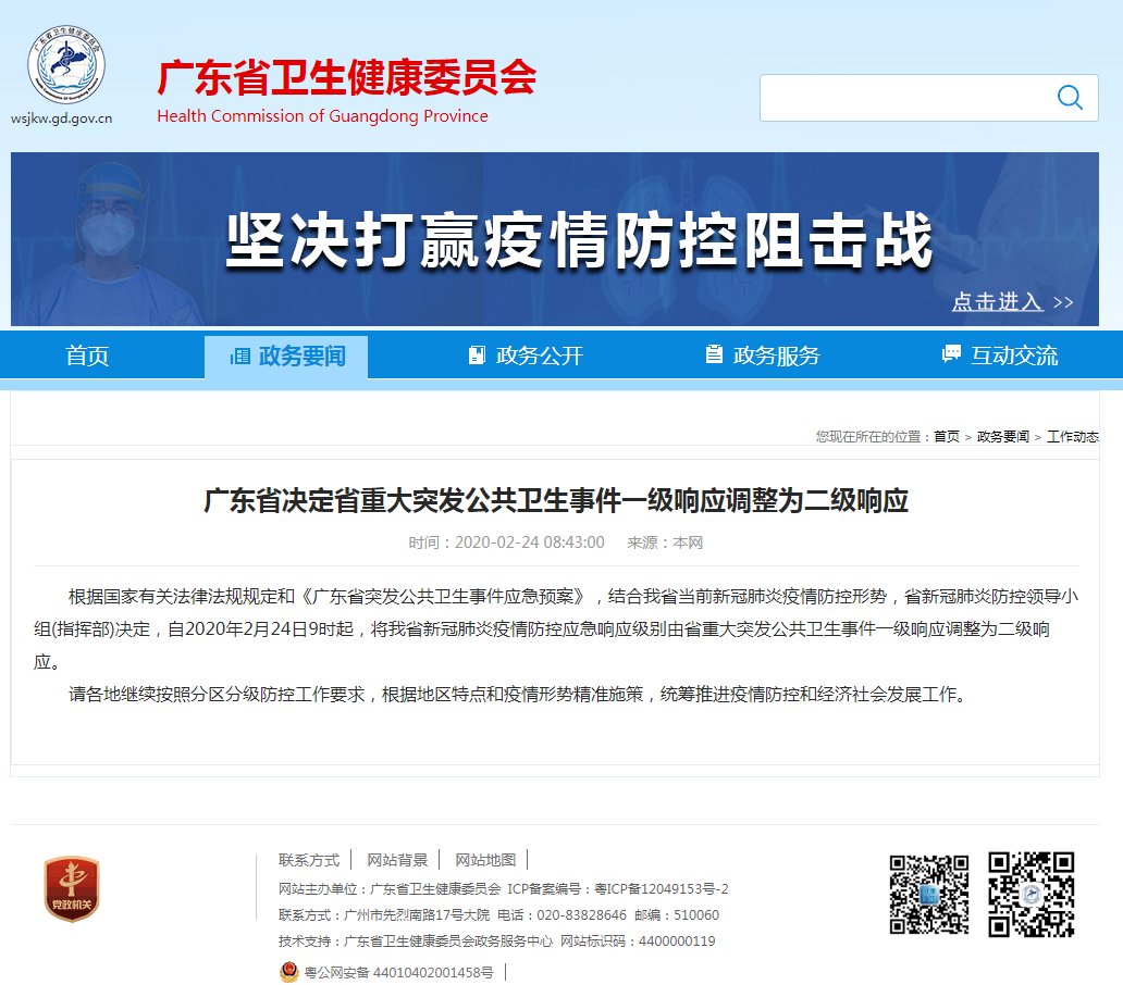 複工通知-廣東衛健委突發公共衛生事件一級響應調整為二級響應